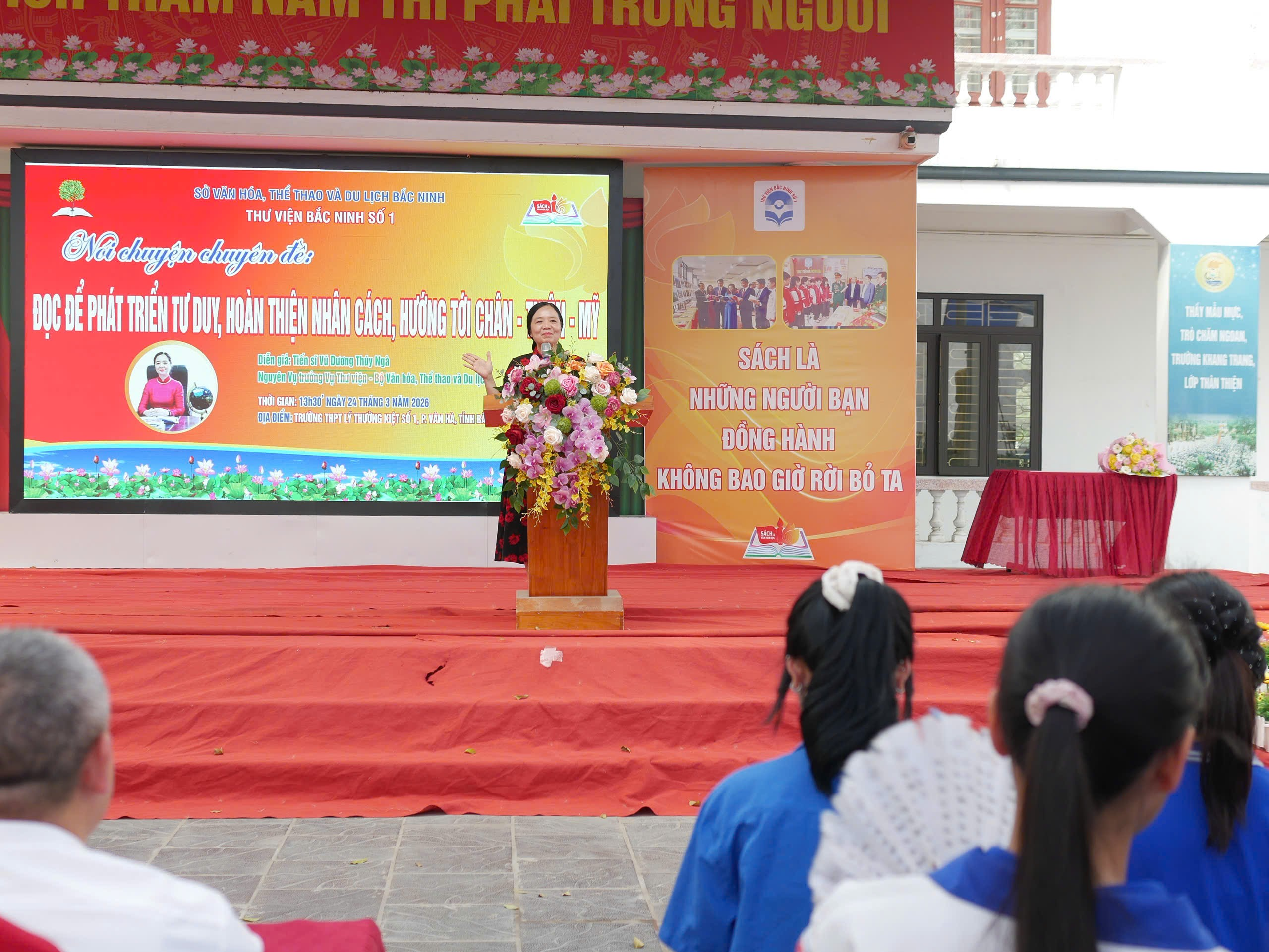 Thực hiện Kế hoạch số 63/KH-THPTLTK1 ngày 23/3/2026 của trường THPT Lý Thường Kiệt số 1 về việc tổ chức các hoạt động hưởng ứng Ngày Sách và Văn hóa đọc Việt Nam năm 2026, chiều ngày 24/3/2026, nhà trường phối hợp với Thư viện Bắc Ninh số 1 tổ chức chương trình nói chuyện chuyên đề với chủ đề “Đọc để phát triển tư duy, hoàn thiện nhân cách, hướng tới Chân - Thiện - Mỹ”, thu hút sự tham gia của toàn thể cán bộ, giáo viên và học sinh toàn trường.