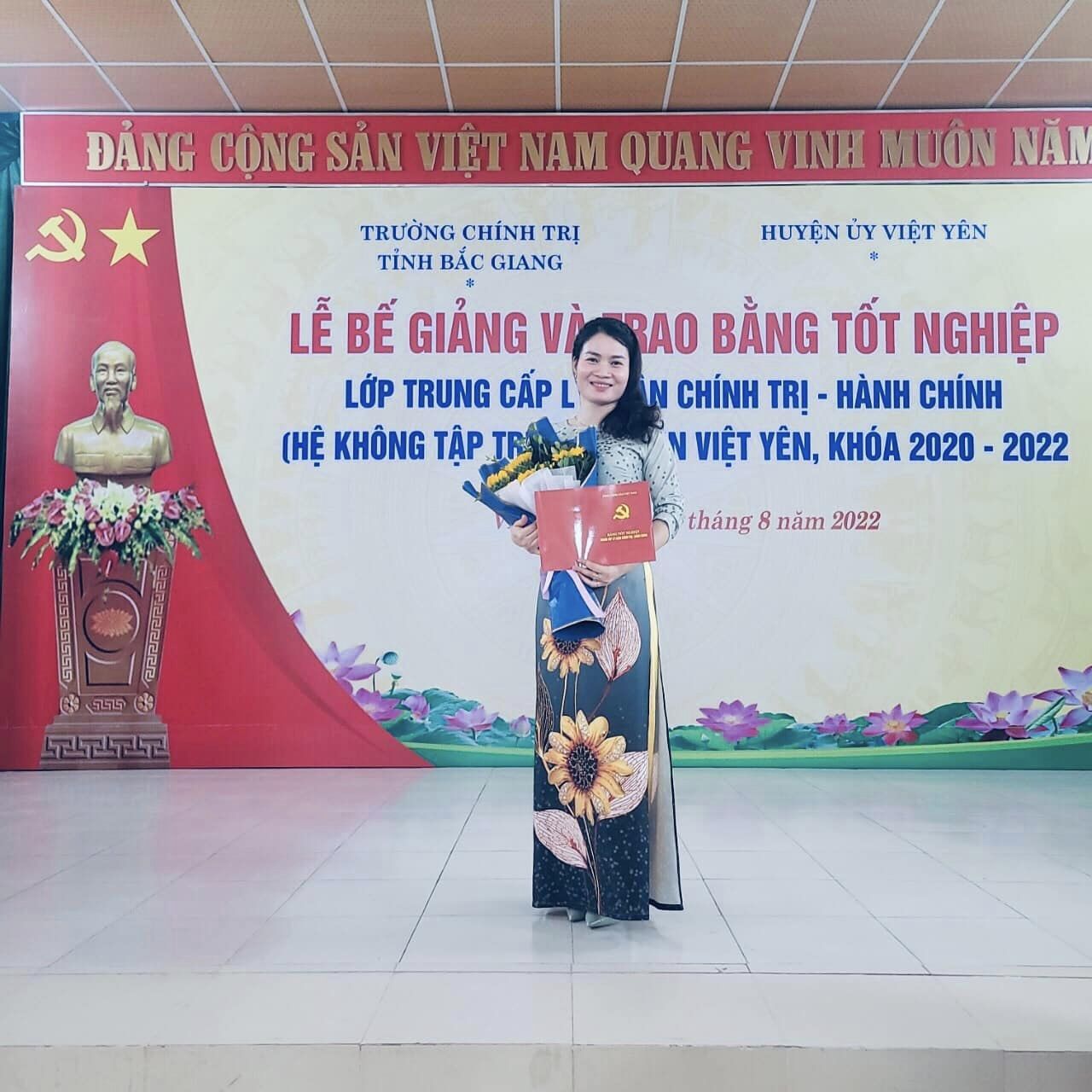 Với những nỗ lực không ngừng của bản thân, cô đã được công nhận là Giáo viên dạy giỏi cấp Tỉnh chu kì 2020 – 2024; hai năm liên tục đạt danh hiệu Chiến sĩ thi đua cấp cơ sở; hai lần nhận giấy khen của chủ tịch UBND Huyện Việt Yên; năm học 2019 – 2020 cô được nhận Bằng khen của chủ tịch Tỉnh Bắc Giang và nhiều thành tích khác…