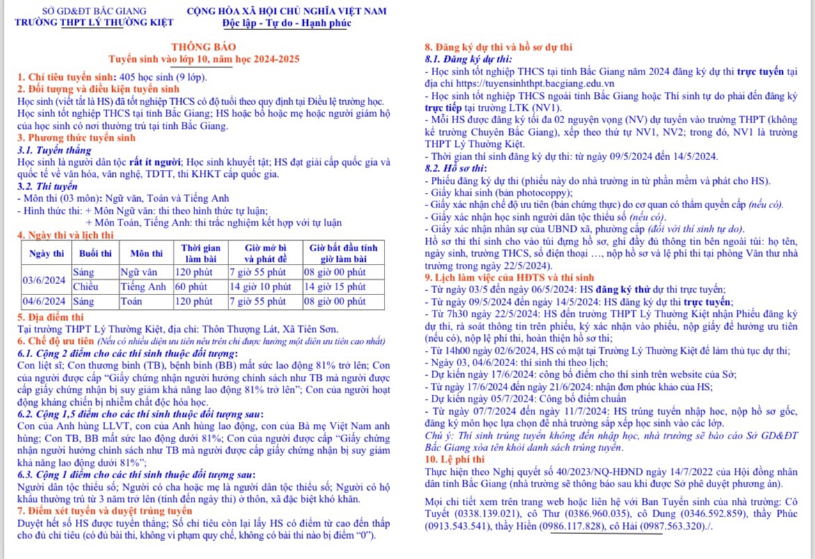 Thông báo tuyển sinh vào lớp 10, năm học 2024 -2025