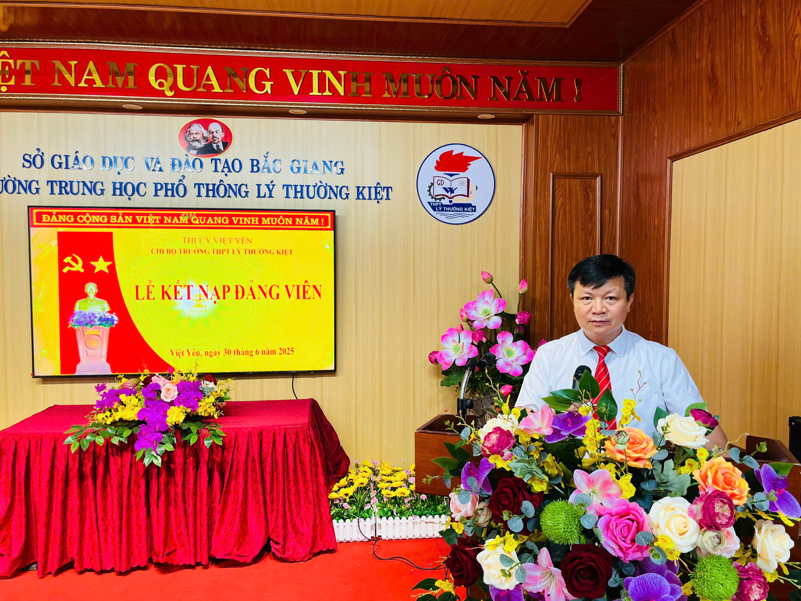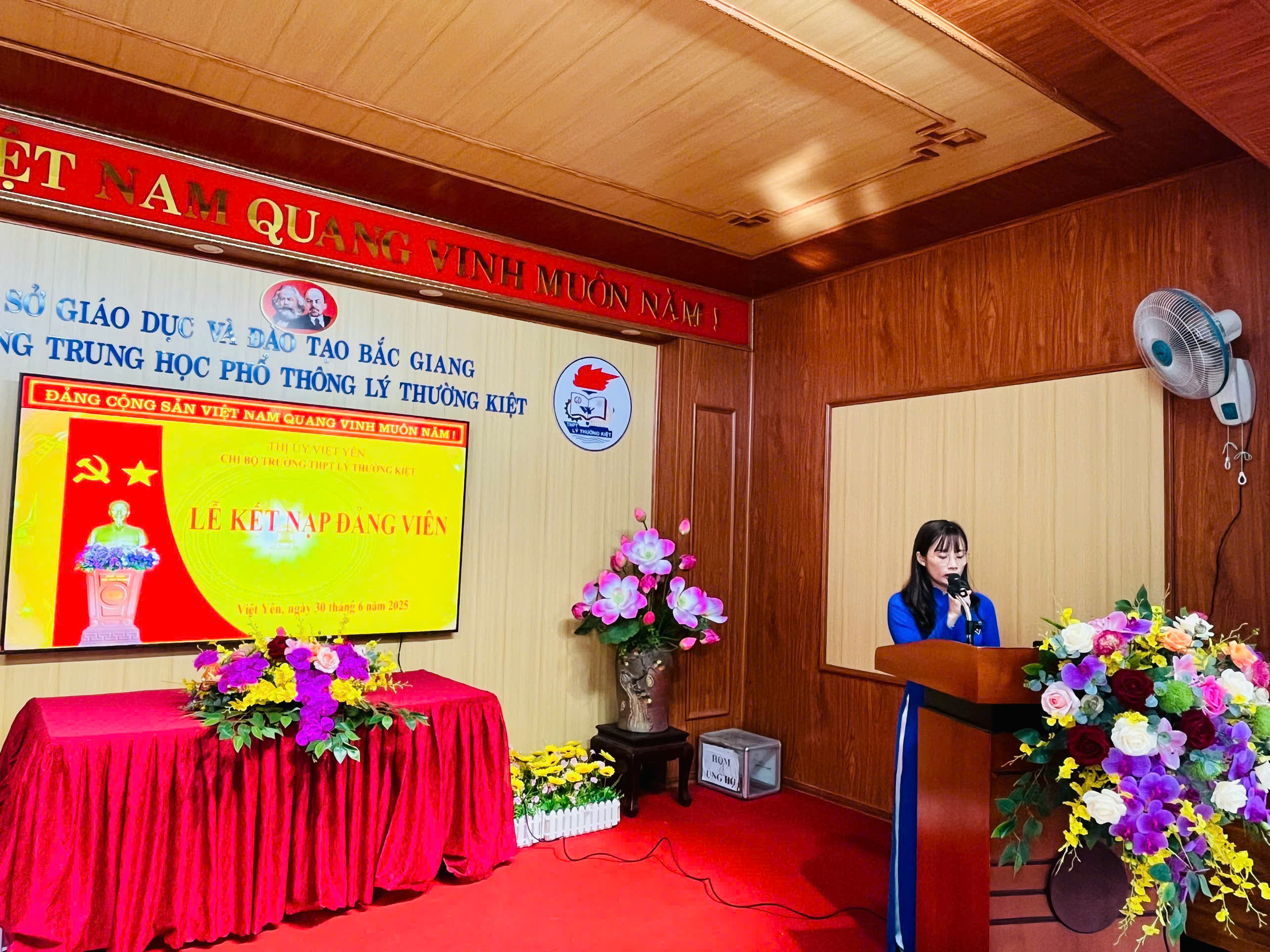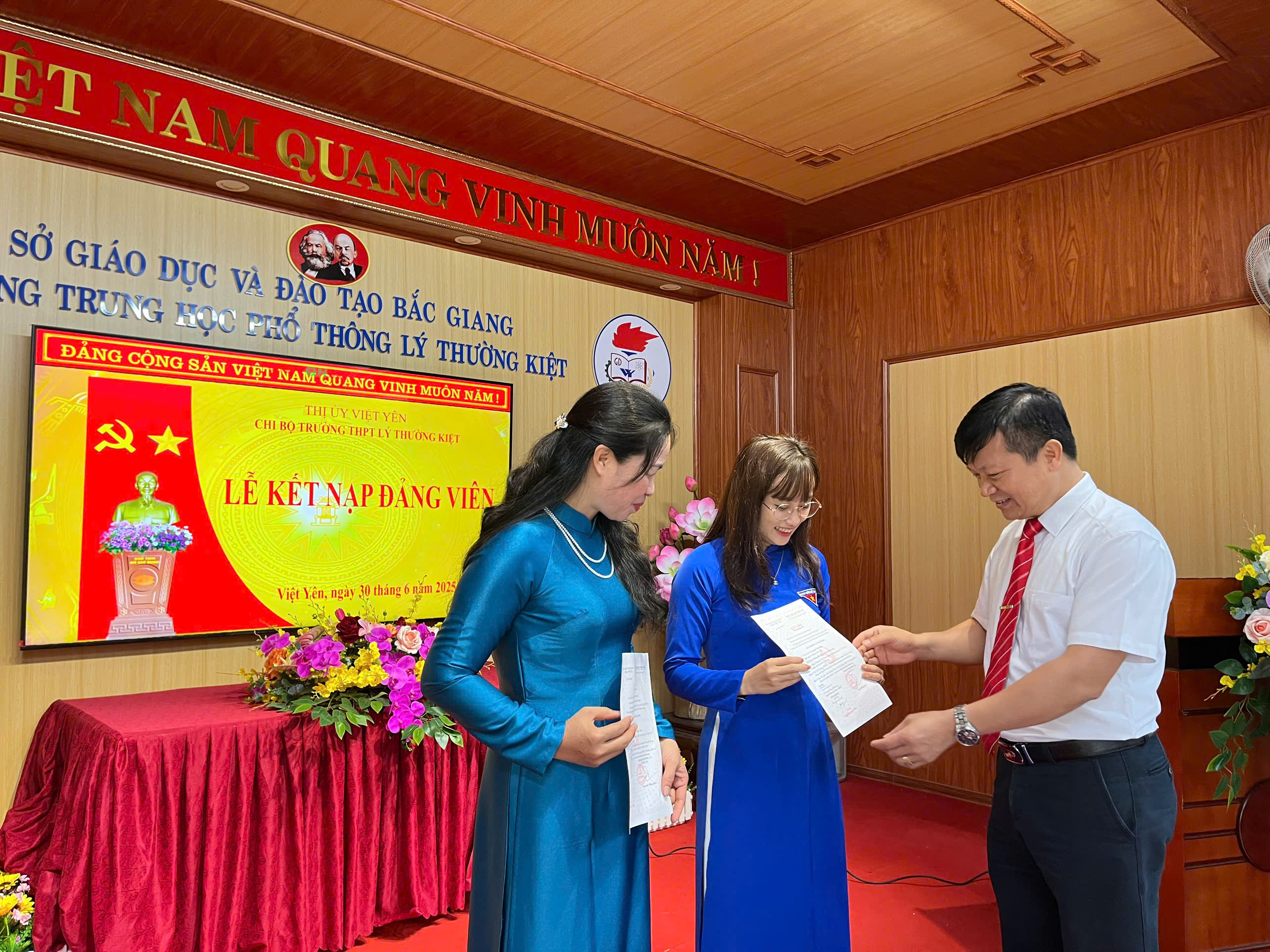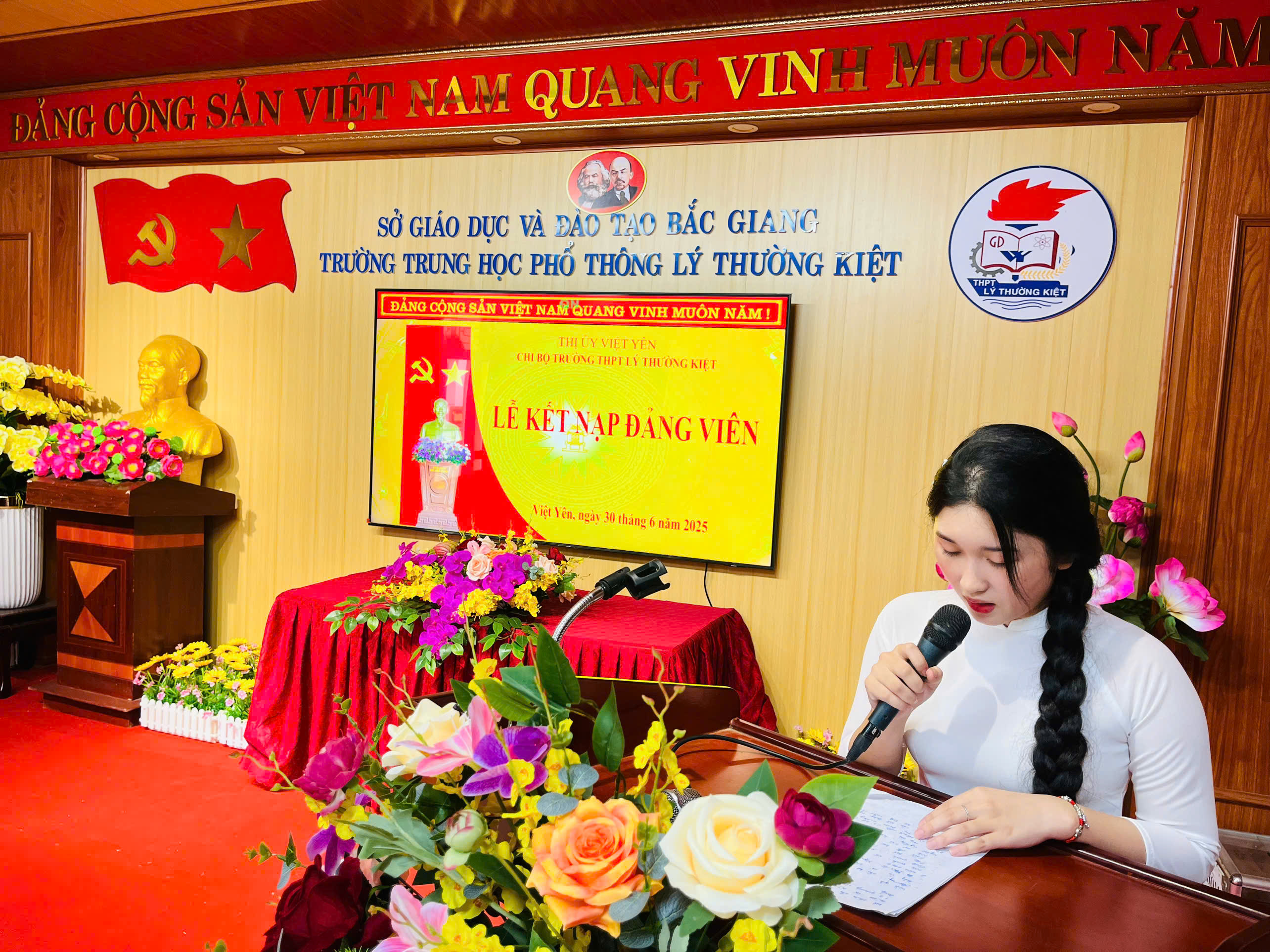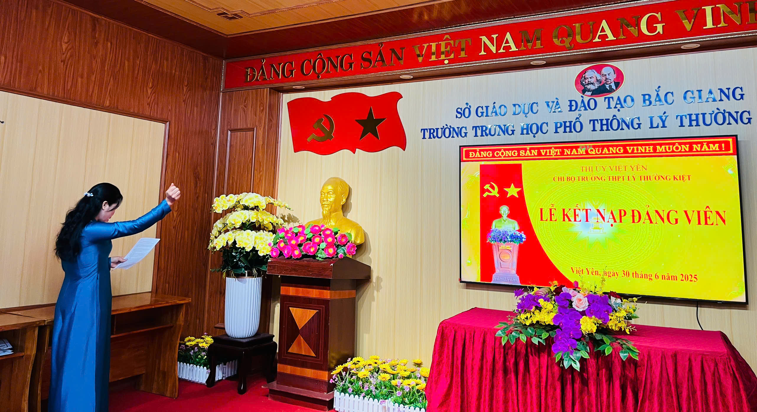Sinh thời Chủ tịch Hồ Chí Minh đã khẳng định: "Vấn đề phát triển Đảng là vấn đề quan trọng trong xây dựng Đảng. Đảng phải có một số lượng đảng viên nhất định mới hình thành nên tổ chức đảng. Sự nghiệp lãnh đạo cách mạng của Đảng là sự nghiệp vĩ đại lâu dài phải do nhiều thế hệ chiến sĩ cộng sản tham gia gánh vác. Năng lực lãnh đạo và sức chiến đấu chỉ có thể có trên cơ sở số lượng, chất lượng đội ngũ đảng viên tương ứng. Do đó, Đảng phải thường xuyên làm tốt công tác phát triển đảng". Thực hiện Quyết định số: 1198-QĐ/TU ngày 18/06/2025 của Thị ủy Việt Yên về quyết định kết nạp đảng viên. Ngày 30/6/2025, được sự đồng ý của Thị ủy Việt Yên, Chi bộ Trường THPT Lý Thường Kiệt tổ chức Lễ kết nạp đảng viên cho 15 quần chúng đoàn viên ưu tú vào Đảng Cộng sản Việt Nam.