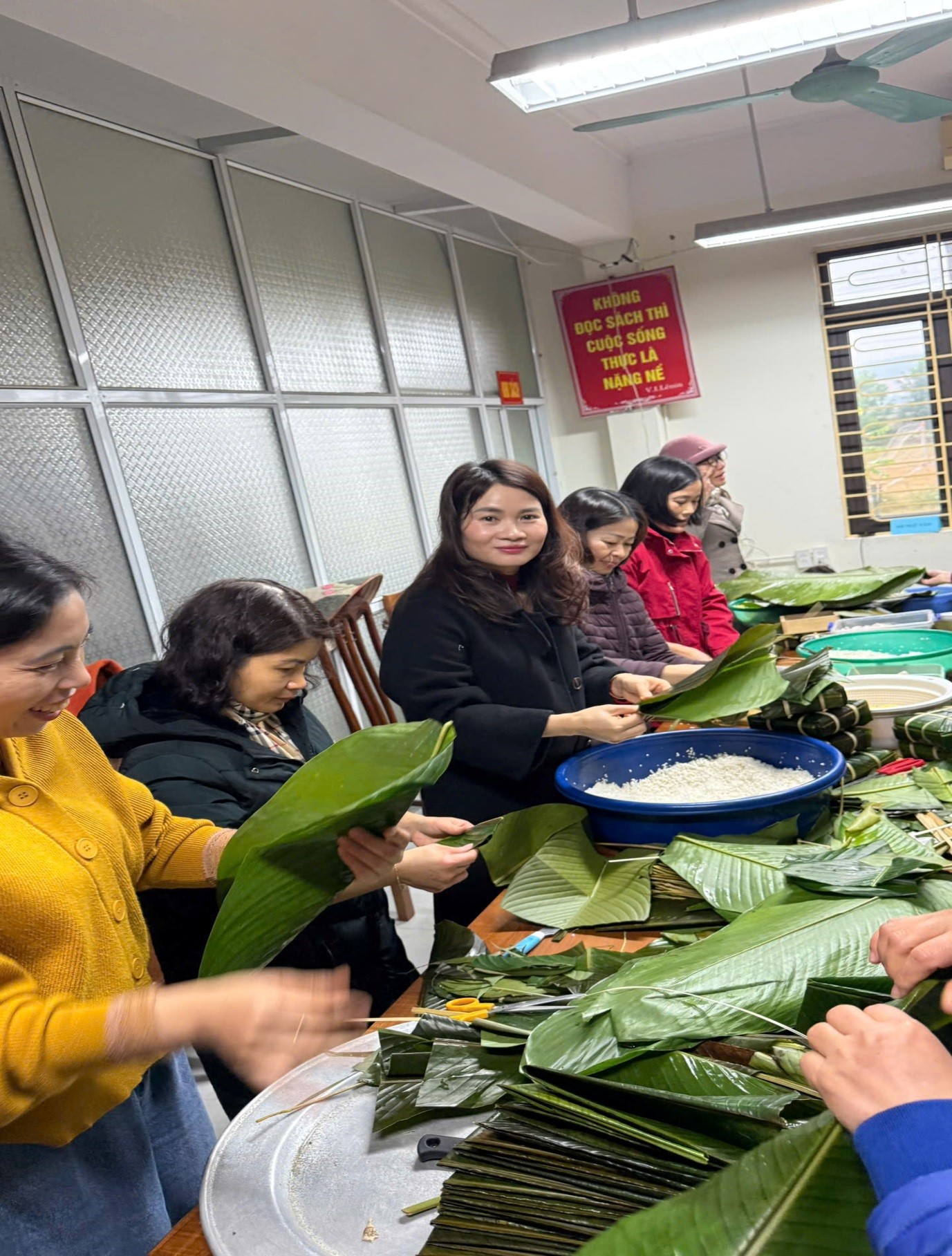 Hình ảnh các cô tổ Xã hội và tổ Lý – Tin tham gia Hội thi gói bánh chưng xanh