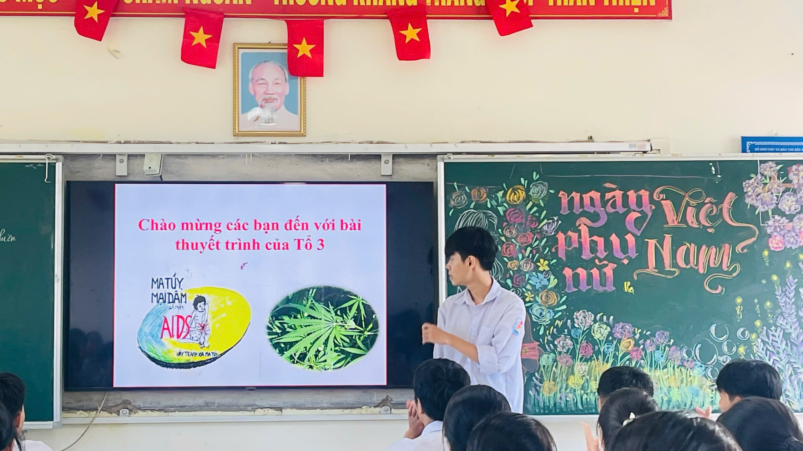 Học sinh tự tin thuyết trình những hiểu biết về ma tuý trong giờ học GDQP-AN tại lớp 10A3 của cô giáo Nguyễn Thị Thảo(GV dạy môn Quốc phòng AN)