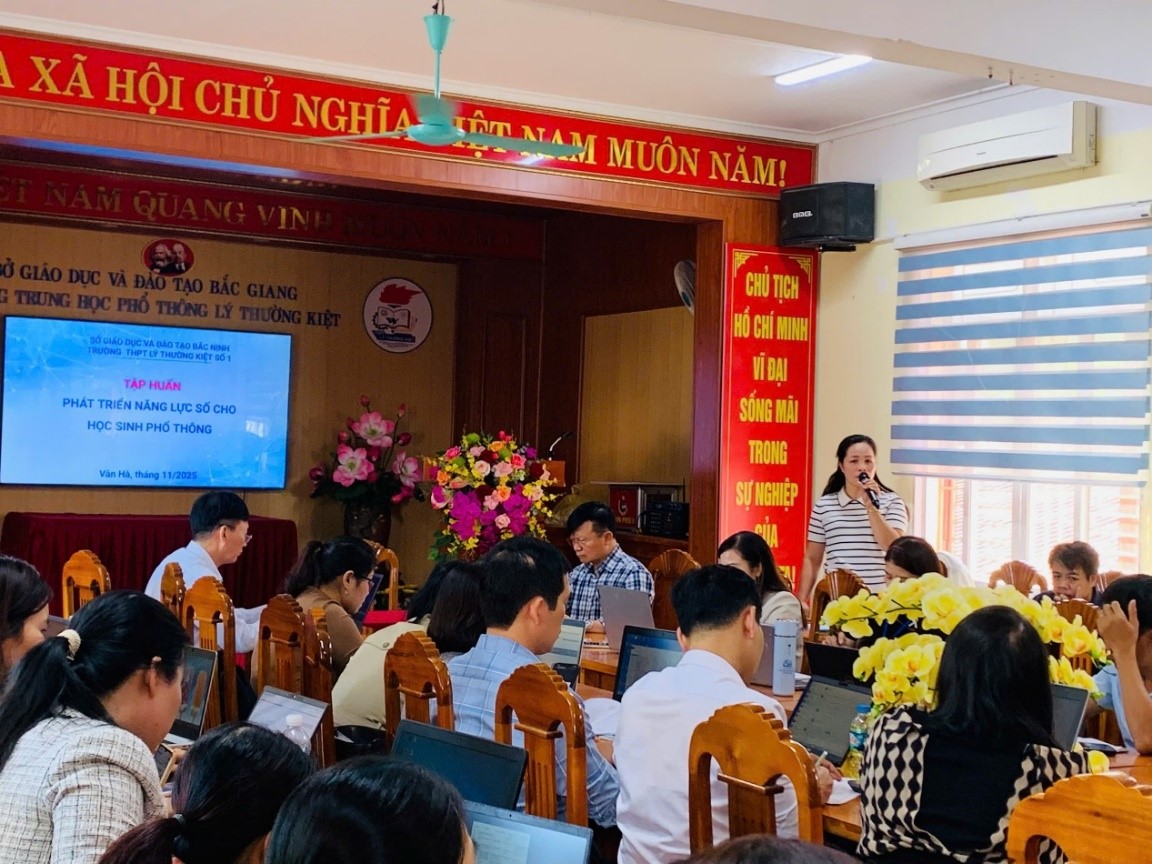 Thực hiện Công văn số 1459/SGDĐT-GDTrH ngày 05/11/2025 của Sở giáo dục và đào tạo Bắc Ninh về việc triển khai tập huấn CBQL, GV về phát triển năng lực số cho học sinh phổ thông, ngày 14 tháng 11 năm 2025, Trường THPT Lý Thường Kiệt số 1 đã tổ chức buổi tập huấn “Phát triển năng lực số cho học sinh trung học phổ thông” cho toàn thể cán bộ giáo viên trong nhà trường theo mô hình 5:1:3 (05 ngày tự học, 01 buổi trao đổi thảo luận và 03 ngày hoàn thiện sản phẩm).