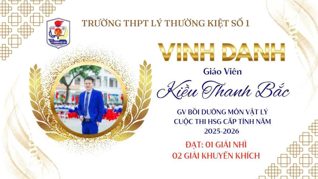 Với môn Vật lý, Thầy Kiều Thanh Bắc luôn tâm huyết với công tác bồi dưỡng học sinh giỏi. Thầy chú trọng rèn tư duy logic, khả năng phân tích và giải quyết vấn đề cho học sinh. Trong quá trình ôn luyện, thầy luôn đồng hành, động viên và tạo môi trường học tập tích cực. Nhờ đó, đội tuyển đạt 01 giải Nhì và 02 giải Khuyến khích cấp tỉnh. Thành tích thể hiện rõ vai trò, trách nhiệm và năng lực chuyên môn của thầy.