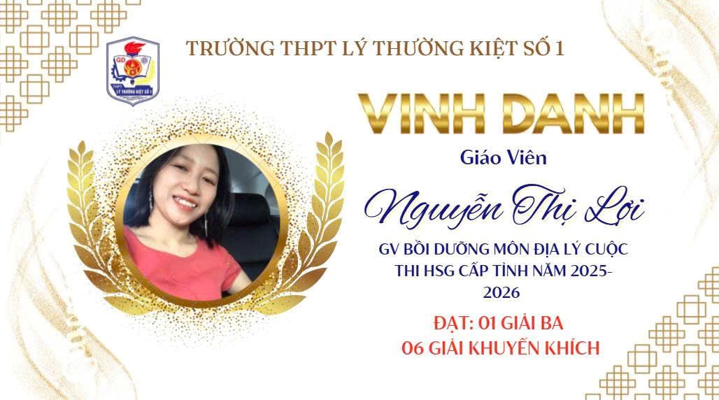 Đặc biệt, ở bộ môn Địa lý, cô Nguyễn Thị Lợi với 07 học sinh dự thi đã xuất sắc mang về 01 giải Ba và 06 giải Khuyến khích. Cô Nguyễn Thị Lợi luôn tận tụy, trách nhiệm trong công tác bồi dưỡng học sinh giỏi môn Địa lý. Cô chú trọng rèn kỹ năng phân tích số liệu, khai thác bản đồ và liên hệ thực tiễn cho học sinh. Với sự đồng hành sát sao, cô đã tạo được sự tiến bộ đồng đều cho đội tuyển. Thành tích thể hiện rõ tâm huyết và hiệu quả bồi dưỡng của cô.